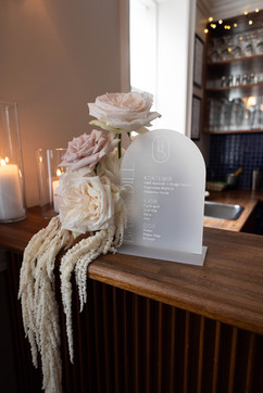 Salurinn verður skreyttur fallegum seríum og efni í lofti til að gera hann draumakendann með yndislegum blómum og kertum dreift yfir tignarlegu langborðin. Stólarnir voru leigðir frá mér ásamt, dúkum, renningum og sérvettum. Matseðlarnir bjuggu til falleg form og skugga paraðir saman við tausérvétturnar sem voru í léttum kremuðum tón. Einnig hannaði ég og bjó til banner sem var bakvið brúðhjónin með texta úr uppáhalds laginu þeirra og lagið sem var undir fyrsta dansinum þeirra sem hjón. Þetta þjónaði líka þeim tilgangi að fela innstungu sem var á slæmum stað einmitt á miðjum veggnum. Stór rúnuð plexigler skilti voru á gólfinu sem borðnúmer og voru barseðlarnir í stíl. Þau voru með flottan hvítann blómavegg með led skilti sem photobooth bagrunn sem paraðist vel við stílin á veislunni og svo var hrist kokteila um kvöldið. Guðdómlegur dagur sem sparaði engin smáatriði, einmitt eins og það á að vera.